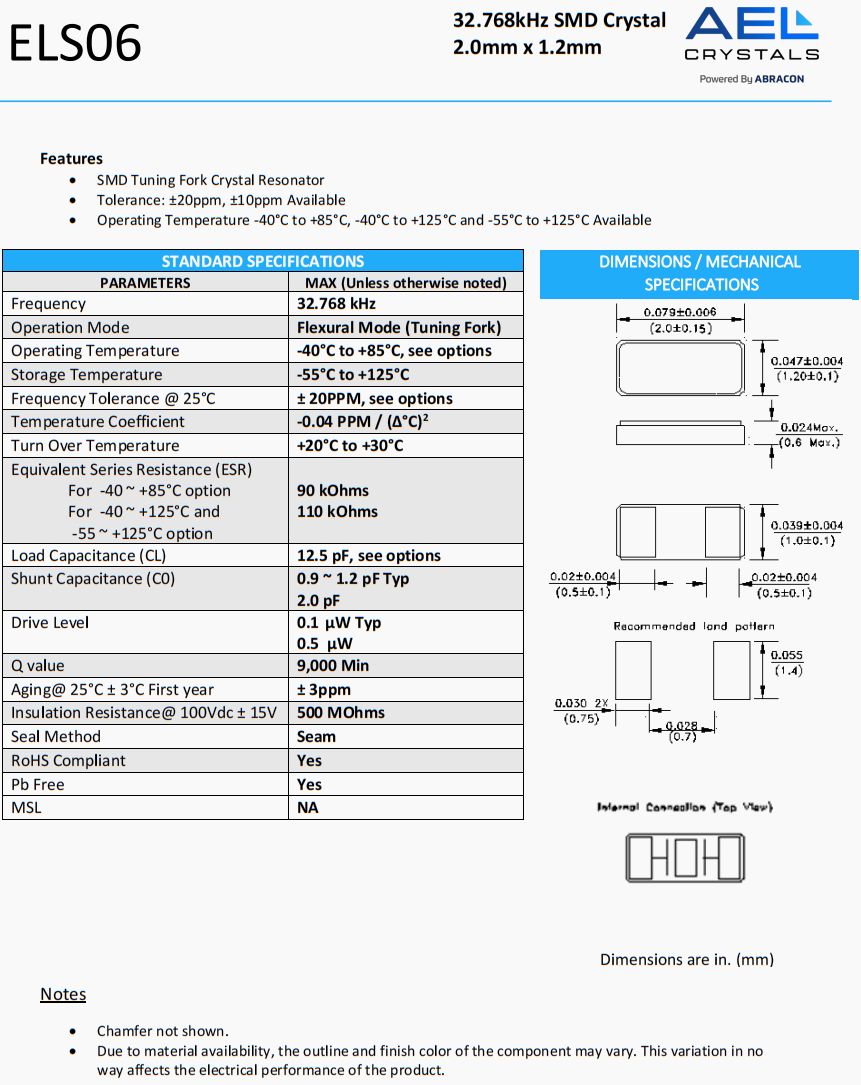 ELS06進(jìn)口晶振,AEL低損耗晶體,ELS06-32.768kHz-9-T車載多媒體晶振