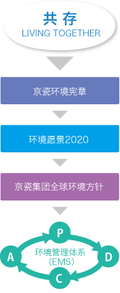 京瓷集團(tuán)在“共存(LIVING TOGETHER)”這一理念的指導(dǎo)下,為構(gòu)建低碳社會(huì)、循環(huán)型社會(huì)、與自然共存的社會(huì),制定了《京瓷環(huán)境憲章》,其中規(guī)定了環(huán)保產(chǎn)品開(kāi)發(fā)、節(jié)能、防止全球變暖、節(jié)約資源、削減廢棄物、化學(xué)物質(zhì)的合理管理、保護(hù)生物多樣性等綜合性的環(huán)保措施.