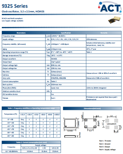 ACT晶振,9325晶振,SPXO振蕩器.3225mm體積非常小的SMDcrystal器件,是民用小型無線數碼產品的最佳選擇,小體積的晶振被廣泛應用到,手機藍牙,GPS定位系統,無線通訊集,高精度和高頻率的穩定性能,非常好的減少電磁干擾的影響,是民用無線數碼產品最好的選擇,符合RoHS/無鉛.