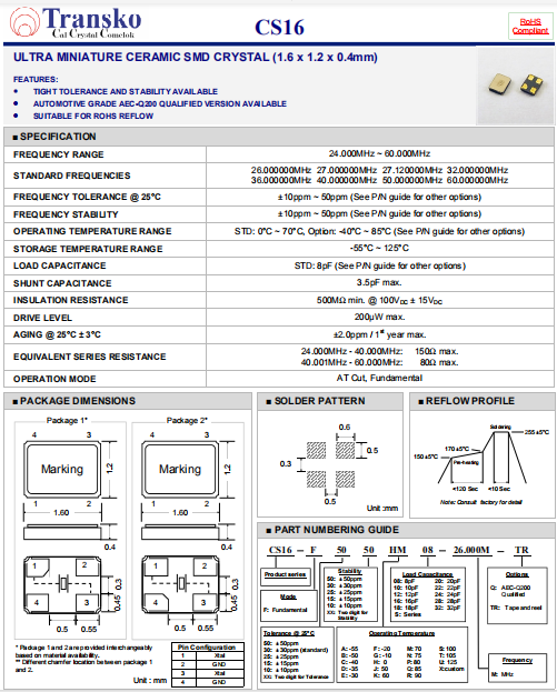Transko晶振,CS16晶振,無鉛環(huán)保晶體.貼片壓電石英晶體,體積小,焊接可采用自動貼片系統(tǒng),產(chǎn)品本身小型,表面貼片晶振,特別適用于有小型化要求的電子數(shù)碼產(chǎn)品市場領(lǐng)域,因產(chǎn)品小型,薄型優(yōu)勢,耐環(huán)境特性,包括耐高溫,耐沖擊性等,在移動通信領(lǐng)域得到了廣泛的應(yīng)用,晶振產(chǎn)品本身可發(fā)揮優(yōu)良的電氣特性,滿足無鉛焊接的高溫回流溫度曲線要求.