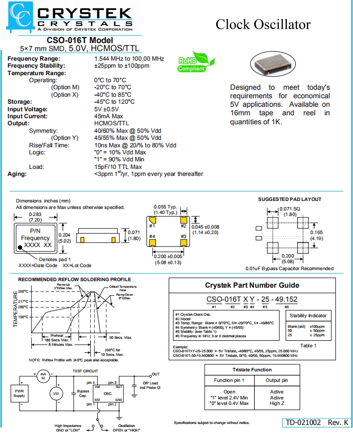 CRYSTEK晶振,CSO-016T晶振,高質(zhì)量有源振蕩器.貼片式石英晶體振蕩器,低電壓?jiǎn)?dòng)功率,并且有多種電壓供選擇,比如有1.8V,2.5V,3.3V,3.8V,5V等,產(chǎn)品被廣泛應(yīng)用于,平板筆記本,GPS系統(tǒng),光纖通道,千兆以太網(wǎng),串行ATA,串行連接SCSI,PCI-Express的SDH/SONET發(fā)射基站等領(lǐng)域.符合RoHS/無(wú)鉛.