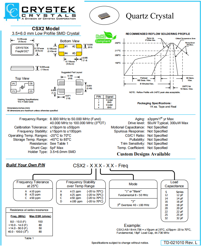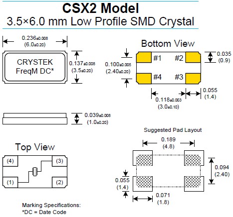 CRYSTEK晶振,CSX2晶振,耐高溫石英晶體.普通貼片石英晶振外觀使用金屬材料封裝的,具有高穩(wěn)定性,高可靠性的石英晶體諧振器,晶振外觀本身使用金屬封裝,充分的密封性能,可確保其高可靠性,采用編帶包裝,外包裝采用朔膠盤,可在自動貼片機上對應(yīng)自動貼裝等優(yōu)勢.
