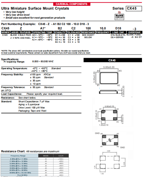 Cardinal晶振,CX45晶振,低功耗石英晶體.智能手機晶振,產品具有高精度超小型的表面貼片型石英晶體振蕩器,最適用于移動通信終端的基準時鐘等移動通信領域.比如智能手機,無線通信,衛星導航,平臺基站等較高端的數碼產品,晶振本身小型,薄型具備各類移動通信的基準時鐘源用頻率,貼片晶振具有優良的電氣特性,耐環境性能適用于移動通信領域,滿足無鉛焊接的高溫回流溫度曲線要求.