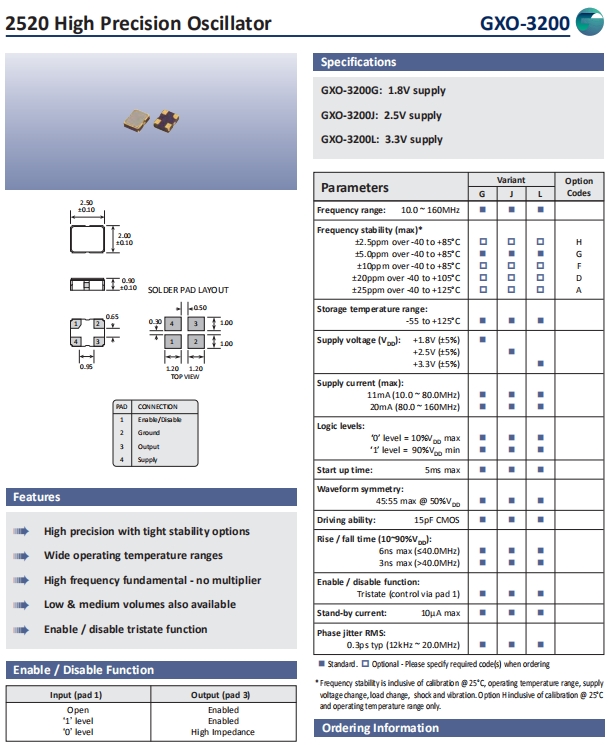 Golledge晶振,GXO-3200晶振,進口水晶振蕩子.小型貼片有源晶振,體積的變小也使產品帶來了更高的穩(wěn)定性能,接縫密封石英晶體振蕩器,精度高,覆蓋頻率范圍寬的特點,貼片高速自動安裝和高溫回流焊設計,Optionable待機輸出三態(tài)輸出功能,電源電壓范圍:1.8V?5V,高穩(wěn)定性,低抖動,低功耗,主要應用領域:無線通訊,智能手機,平板筆記本WLAN,藍牙,數(shù)碼相機,DSL和各式IT產品的晶振應用,三態(tài)功能,PC和LCDM等數(shù)碼領域,符合RoHS/無鉛.