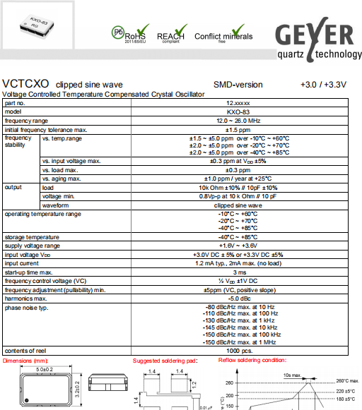 Geyer晶振,KXO-83晶振,壓控溫補(bǔ)振蕩器.小型SMD有源晶振,從最初超大體積到現(xiàn)在的7050mm,6035mm,5032mm,3225mm,2520mm體積,有著翻天覆地的改變,體積的變小也使產(chǎn)品帶來了更高的穩(wěn)定性能,接縫密封石英晶體振蕩器,精度高,覆蓋頻率范圍寬的特點(diǎn),SMD高速自動安裝和高溫回流焊設(shè)計(jì),Optionable待機(jī)輸出三態(tài)輸出功能,電源電壓范圍:1.8V?5 V,高穩(wěn)定性,低抖動,低功耗,主要應(yīng)用領(lǐng)域:無線通訊,高端智能手機(jī),平板筆記本W(wǎng)LAN,藍(lán)牙,數(shù)碼相機(jī),DSL和其他IT產(chǎn)品的晶振應(yīng)用,三態(tài)功能,PC和LCDM等高端數(shù)碼領(lǐng)域,符合RoHS/無鉛.