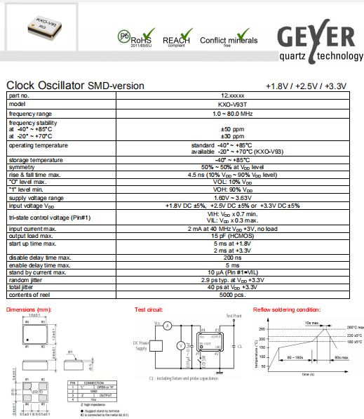 Geyer晶振,KXO-V93T晶振,高質量晶體振蕩器.普通貼片石英晶振外觀使用金屬材料封裝的,具有高穩(wěn)定性,高可靠性的石英晶體振蕩器,晶振外觀本身使用金屬封裝,充分的密封性能,可確保其高可靠性,采用編帶包裝,外包裝采用朔膠盤,可在自動貼片機上對應自動貼裝等優(yōu)勢
