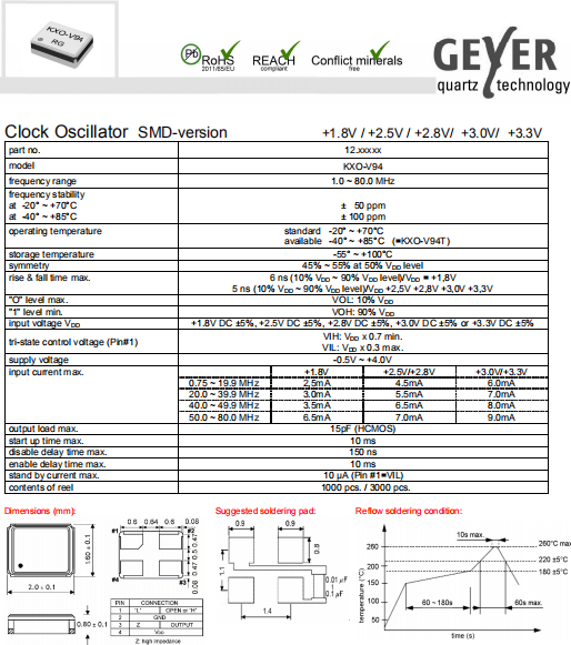Geyer晶振,KXO-V94晶振,普通有源晶體振蕩器.貼片式石英晶體振蕩器,低電壓啟動功率,并且有多種電壓供選擇,比如有1.8V,2.5V,3.3V,3.8V,5V等,產品被廣泛應用于,平板筆記本,GPS系統,光纖通道,千兆以太網,串行ATA,串行連接SCSI,PCI-Express的SDH / SONET發射基站等領域.符合RoHS/無鉛.