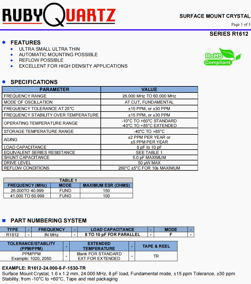 | Raltron晶振 | 單位 | R1612晶振 | 石英晶振基本條件 |