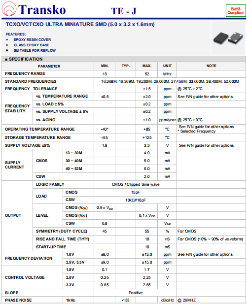 Transko晶振,TE-J晶振,壓控溫補晶體振蕩器.貼片式石英晶體振蕩器,低電壓啟動功率,并且有多種電壓供選擇,比如有1.8V,2.5V,3.3V,3.8V,5V等,產品被廣泛應用于,平板筆記本,GPS系統,光纖通道,千兆以太網,串行ATA,串行連接SCSI,PCI-Express的SDH / SONET發射基站等領域.符合RoHS/無鉛.