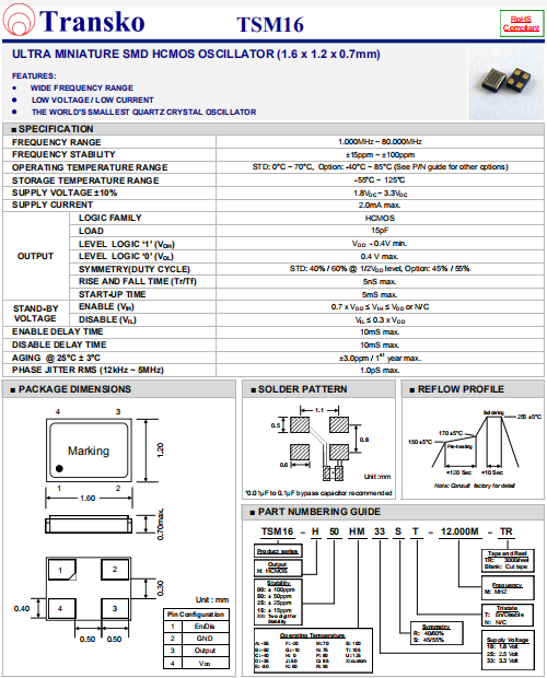Transko晶振,TSM16晶振,高精度晶振.小體積SMD時鐘晶體振蕩器,是貼片石英晶振,兆赫頻率元件,應用于時鐘模塊,智能手機,全球定位系統,因產品本身體積小,SMD編帶型,可應用于高性能自動貼片焊接,被廣泛應用到各種小巧的便攜式消費電子數碼時間產品,環保性能符合ROHS/無鉛標準.