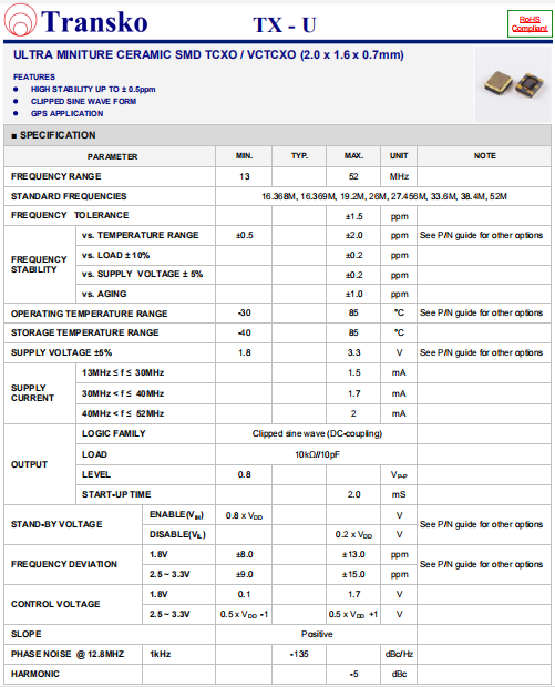 Transko晶振,TX-U晶振,溫度補償晶振.貼片晶振本身體積小,超薄型石英晶體振蕩器,特別適用于有目前高速發展的高端電子數碼產品,因為晶振本身小型化需求的市場領域,小型,薄型是對應陶瓷振蕩器(偏差大)和普通的石英晶體振蕩器(偏差?。┑闹虚g領域的一種性價比較出色的產品.產品廣泛用于筆記本電腦,無線電話,衛星導航HDD, SSD, USB, Blu-ray等用途,符合無鉛焊接的高溫回流焊曲線特性.