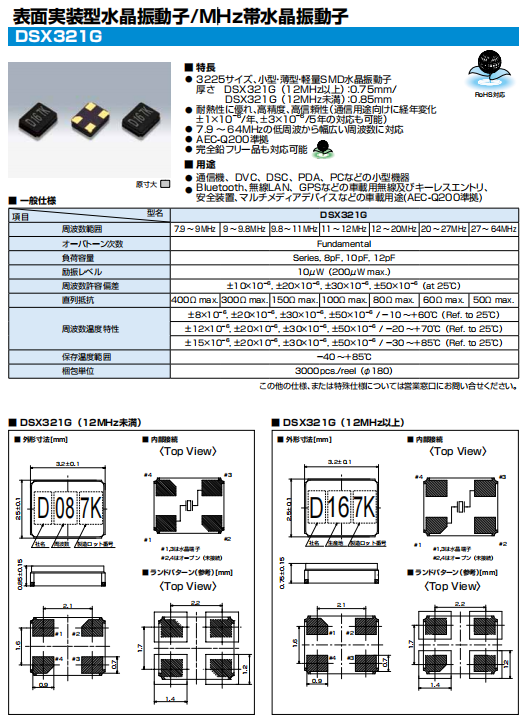 | KDS晶振 | 7AD01200A1R | DSX321G | 3225 | 12.000MHZ | |