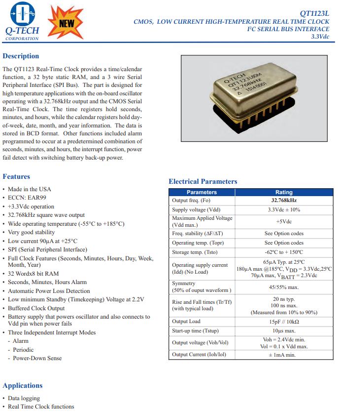 QT1123L88M-32.768kHz,實(shí)時(shí)時(shí)鐘應(yīng)用晶振,32.768KHz進(jìn)口晶振,Q-Tech晶振,QT1123L實(shí)時(shí)時(shí)鐘模塊,QT1123L88M-32.768kHz晶振,石英晶體,該器件設(shè)計(jì)用于板載振蕩器的高溫應(yīng)用,采用32.768kHz輸出和CMOS串行實(shí)時(shí)時(shí)鐘,時(shí)間寄存器保存秒,分鐘和小時(shí),而日歷寄存器保存星期、日期、月份和年份信息,數(shù)據(jù)是以BCD格式存儲,其他功能包括報(bào)警,被編程為在以下預(yù)定組合下發(fā)生 秒、分、小時(shí)、中斷功能、功率 通過切換電池備用電源進(jìn)行故障檢測,實(shí)時(shí)時(shí)鐘應(yīng)用晶振,數(shù)據(jù)記錄晶振.
