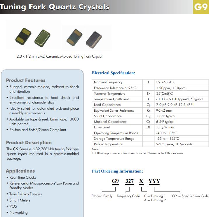 G93270002 Diodes晶振 SaRonix-eCera™ G9 kHz Crystal (Tuning Fork) 32.768kHz -