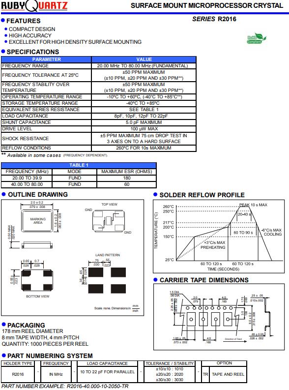 R2016貼片諧振器,Rubyquartz高質(zhì)量晶體,R2016-20.000-10-2050-TR晶振,貼片晶振本身體積小,超薄型石英晶體振蕩器,特別適用于有目前高速發(fā)展的高端電子數(shù)碼產(chǎn)品,因為晶振本身小型化需求的市場領(lǐng)域,小型,薄型是對應(yīng)陶瓷振蕩器(偏差大)和普通的石英晶體振蕩器(偏差小)的中間領(lǐng)域的一種性價比較出色的產(chǎn)品.產(chǎn)品廣泛用于筆記本電腦,無線電話,衛(wèi)星導航SSD,USB,Blu-ray等用途,符合無鉛焊接的高溫回流焊曲線特性.