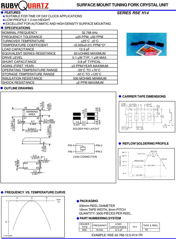 Rubyquartz晶振,RSE-H14貼片諧振器,RSE-32.768-12.5-H14-TR音叉晶體,32.768KHz時(shí)鐘晶體具有小型,薄型,輕型的貼片晶振表面音叉型晶體振蕩器,產(chǎn)品具有優(yōu)良的耐熱性,耐環(huán)境特性,可發(fā)揮晶振優(yōu)良的電氣特性,符合RoHS規(guī)定,滿足無鉛焊接的高溫回流溫度曲線要求,金屬外殼的封裝使得產(chǎn)品在封裝時(shí)能發(fā)揮比陶瓷振蕩器外殼更好的耐沖擊性.