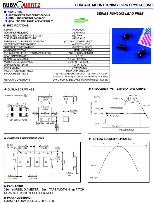 Rubyquartz高質量晶振,RSM200S水晶振動子,RSM-200S-32.768-12.5-TR晶振,32.768K時鐘晶體具有小型,薄型,輕型的貼片表面音叉型晶體振蕩器,產(chǎn)品具有優(yōu)良的耐熱性,耐環(huán)境特性,可發(fā)揮晶振優(yōu)良的電氣特性,符合RoHS規(guī)定,滿足無鉛焊接的高溫回流溫度曲線要求,金屬外殼的封裝使得產(chǎn)品在封裝時能發(fā)揮比陶瓷振蕩器外殼更好的耐沖擊性.