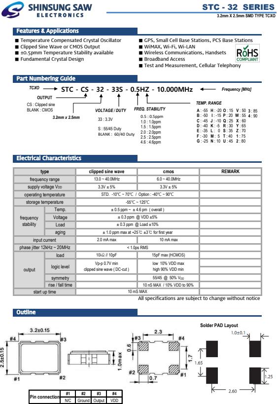 韓國新松晶振,STC-32溫度補償晶體振蕩器,STC-CS-32-33S-0.5HZ-16.000MHz晶振,小型SMD有源晶振,從最初超大體積到現(xiàn)在的7050mm,6035mm,5032mm,3225mm,2520mm體積,有著翻天覆地的改變,體積的變小也使產(chǎn)品帶來了更高的穩(wěn)定性能,接縫密封石英晶體振蕩器,精度高,覆蓋頻率范圍寬的特點,SMD高速自動安裝和高溫回流焊設(shè)計,Optionable待機輸出三態(tài)輸出功能,電源電壓范圍:1.8V~5V,高穩(wěn)定性,低抖動,低功耗,主要應用領(lǐng)域:無線通訊,高端智能手機,平板筆記本W(wǎng)LAN,藍牙,數(shù)碼相機,DSL和其他IT產(chǎn)品的晶振應用,三態(tài)功能,PC和LCDM等高端數(shù)碼領(lǐng)域,符合RoHS/無鉛.