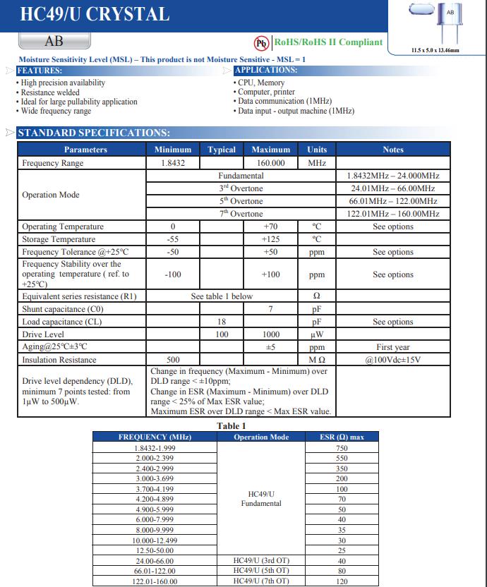 | 頻率容差 | ± 10 ppm, ± 20 ppm, ±50 ppm Max |
