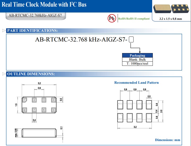 AB-RTCMK系列編碼AB-RTCMC-32.768kHz-AIGZ-S7,I2C總線實(shí)時(shí)時(shí)鐘模塊,小體積晶振尺寸3.2x1.5mm石英晶體振蕩器