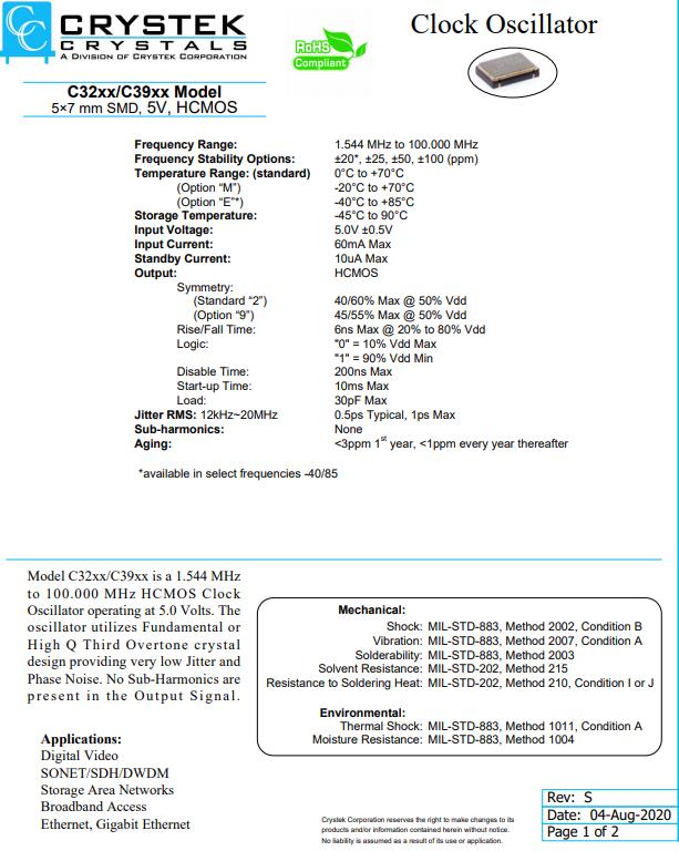 CRYSTEK公司很開發發布了具備創新型的產品,編碼C3291-16.000,C32xx/C39xx型號的頻率為1.544MHz到100.000MHz HCMOS時鐘晶體振蕩器工作在5.0伏。振蕩器利用基頻或高Q第三泛音晶體設計提供非常低的抖動和相位噪聲。沒有次諧波存在于輸出信號中。