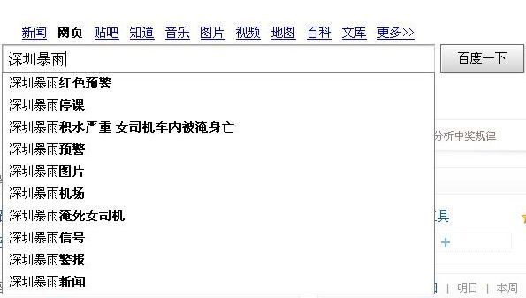例如近日深圳暴風雨交加,許多新聞等節目接連播出關于深圳暴雨紅色預警消息,在網上引起了軒然大波,使得深圳市比往年提前21天宣告入汛。對于“提早報到”的暴雨,我市紅樹林氣象站昨日記錄到第一大小時雨量(114.8毫米),局部地域強降雨集中在寶安、光明、龍華等區,并導致我市150多處不同程度的水浸,部分航班取消。那么對于這件事情,網民主要搜索些什么呢?我們使用“深圳深圳暴雨”做為關鍵詞分別在百度和谷歌上進行了一番測試。