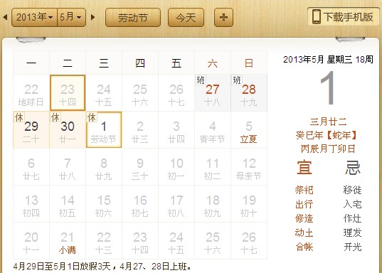 奉天承運,國家黨的安排,2013年5月1號勞動節放假時間如下,4月29號,30號-5月1號,共三天。