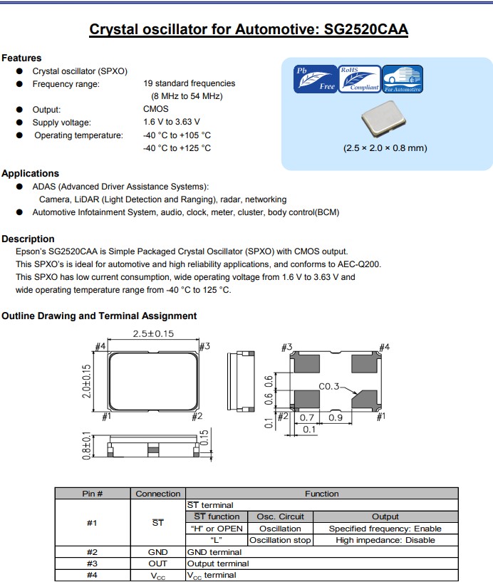 愛普生晶振SG2520CAA是一款具有CMOS輸出的簡(jiǎn)單封裝石英晶體振蕩器(SPXO),小體積尺寸2.5x2.0mm四腳貼片晶振,有源晶振,頻率范圍:8MHz至54MHz,1.6V至3.63V的寬工作電壓以及寬工作溫度范圍-40℃至+105℃/+125℃,該產(chǎn)品具有超小型,輕薄型,低電流消耗,耐高溫晶振,耐熱、耐振、耐沖擊等優(yōu)良的耐環(huán)境特性,滿足無(wú)鉛焊接的高溫回流溫度曲線要求,符合AEC-Q200標(biāo)準(zhǔn),非常適用于汽車和高可靠性應(yīng)用,ADAS(高級(jí)駕駛輔助系統(tǒng)): 攝像頭、激光雷達(dá)(光探測(cè)和測(cè)距)、雷達(dá)、網(wǎng)絡(luò),汽車信息娛樂(lè)系統(tǒng)、音頻、時(shí)鐘、儀表、組合儀表、車身控制(BCM)等。