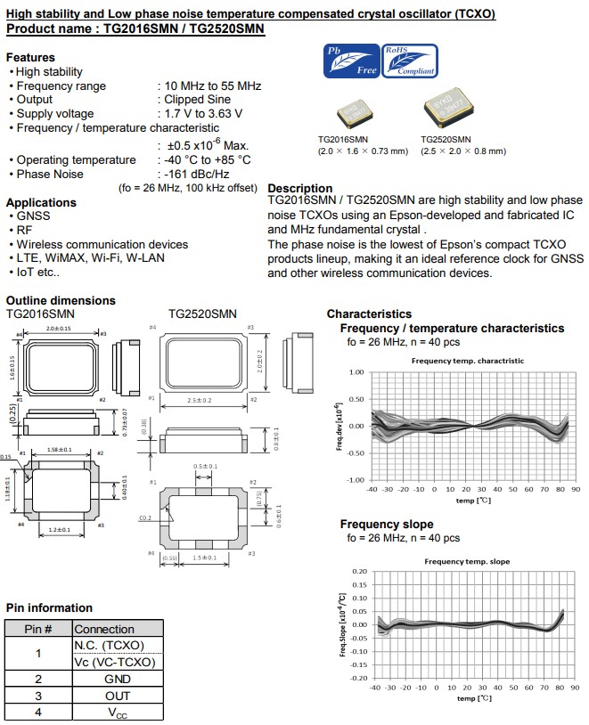 | X1G005421020427 | TG2520SMN | 26.000000 MHz | 2.50 x 2.00 x 0.80 mm | Clipped sine wave | 1.700 to 1.900 V |