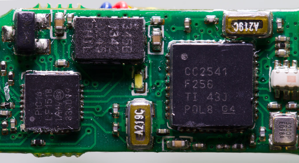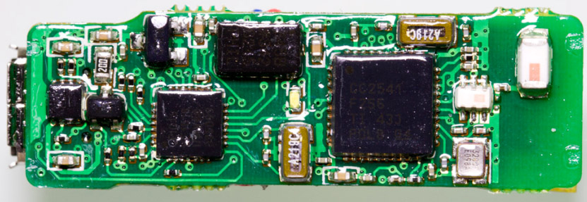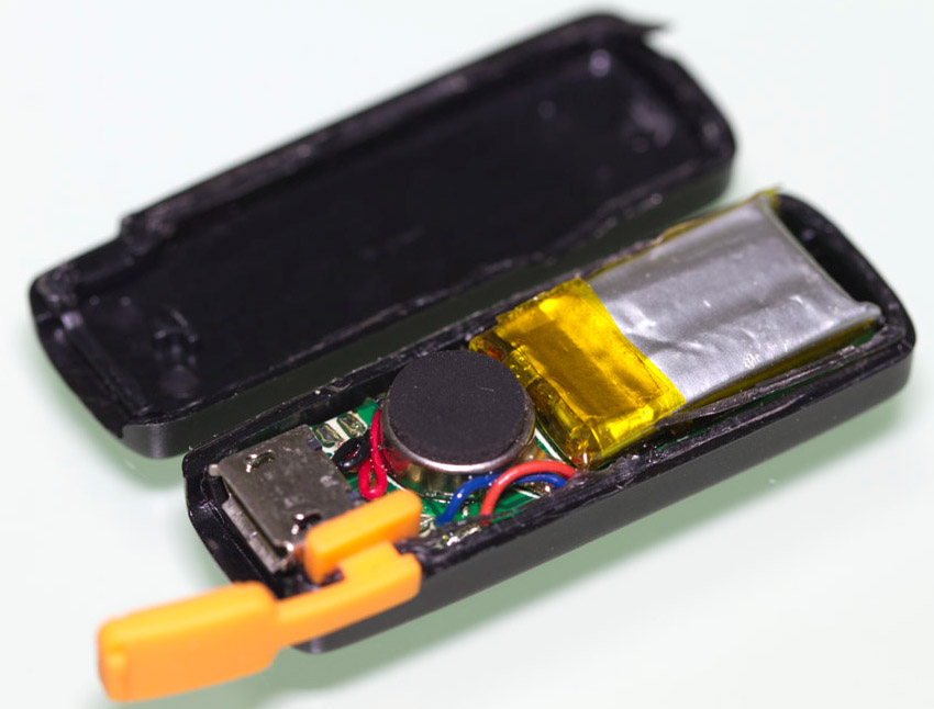 現(xiàn)在就來拆拆手環(huán)主機了,由于手環(huán)外殼采用熱熔接方式,要拆開手環(huán)只能采用暴力方式拆解.揭開外殼,可以看到智能手環(huán)主機電路板和零件,從MicroUSB膠塞固定位置上可以看到膠塞頭并沒有完全密封起來,如果游泳時帶著這個手環(huán)進(jìn)入水中可能會導(dǎo)致進(jìn)水.