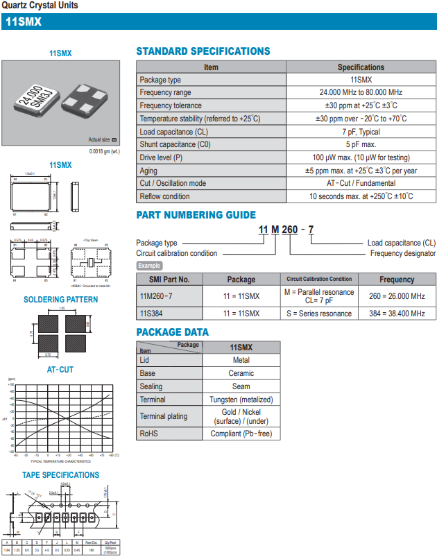 SMI晶振,貼片晶振,11SMX無源晶振.貼片石英晶體,體積小,焊接可采用自動貼片系統,產品本身小型,表面貼片晶振,特別適用于有小型化要求的電子數碼產品市場領域,因產品小型,薄型優勢,耐環境特性,包括耐高溫,耐沖擊性等,在移動通信領域得到了廣泛的應用,晶振產品本身可發揮優良的電氣特性,滿足無鉛焊接的高溫回流溫度曲線要求.