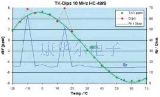 ●檢查活動驟降:在室溫下完美工作的石英晶體在溫度范圍內(nèi)可以顯示出更高的諧振阻抗和更強的頻率跳躍.其原因是主共振與其他形式的振動的干擾共振的耦合,通常僅在狹窄的溫度范圍內(nèi)發(fā)生,并導(dǎo)致所謂的活性下降.具有條紋石英的小型化石英晶體特別容易受到這種傾角的影響,即窄矩形石英盤,尤其是較低的頻率.