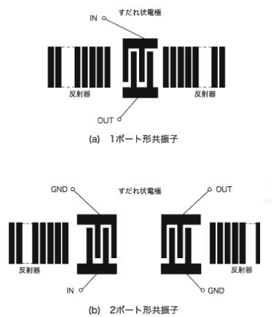 圖三顯示了SAW諧振器的基本結(jié)構(gòu),通過(guò)叉指電極之間產(chǎn)生駐波并增加電極數(shù)量,可以實(shí)現(xiàn)具有高Q的諧振器。圖四所示,SAW諧振器具有(a)單端口諧振器和(b)雙端口諧振器。單端口型石英晶體諧振器中心簾狀電極與設(shè)置在任一側(cè)上的結(jié)構(gòu),以產(chǎn)生駐波的反射器是由叉指電極,諧振器會(huì)激勵(lì)反射器表面反射的。它主要應(yīng)用于使用高Q的諧振器和窄帶濾波器。雙端口型諧振器本身是窄帶濾波器結(jié)構(gòu),將用于所述高Q的振蕩器,高頻帶的窄帶濾波器比單端口型諧振器更優(yōu)越。